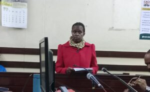 Jackline Kivele Munguti in the dock at the Makadara Law Courts where she was charged with assaulting Victor Kimuyu.