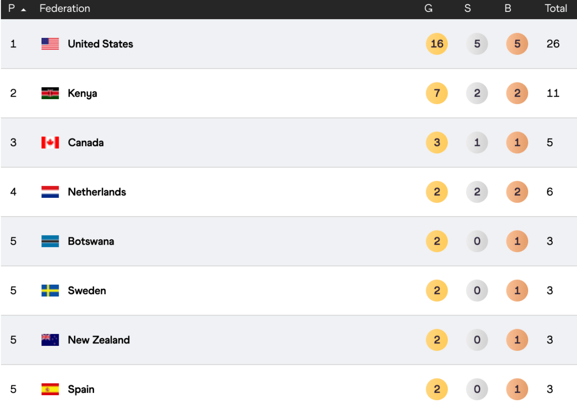 The USA retained its overall title on 26 medals (16 gold, 5 silver, 5 bronze), while Canada finished 3rd (3 gold, 1 silver, 1 bronze), followed by the Netherlands (2 gold, 2 silver, 2 bronze), as Botswana, New Zealand, and Spain were all tied on 2 gold and 1 bronze.